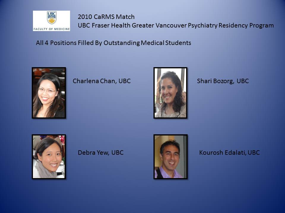 At the undergraduate medical student level, we offer core 3rd year clerkship Psychiatry rotations at our two Regional Teaching Hospitals (Royal Columbian and Surrey Memorial Hospitals) and 4th year elective rotations at the Royal Columbian Hospital. Both of these sites offer highly rated clinical psychiatry rotations with a rich variety of clinical experiences and formal teaching which will provide a solid foundation of core psychiatry training. For those interested in a career in Psychiatry, a Psychiatry rotation in Fraser Health allows medical students to spend time in our two main teaching hospitals, meet our psychiatrists and residents, and find out more about our residency program. Please click on the links below for more details:
